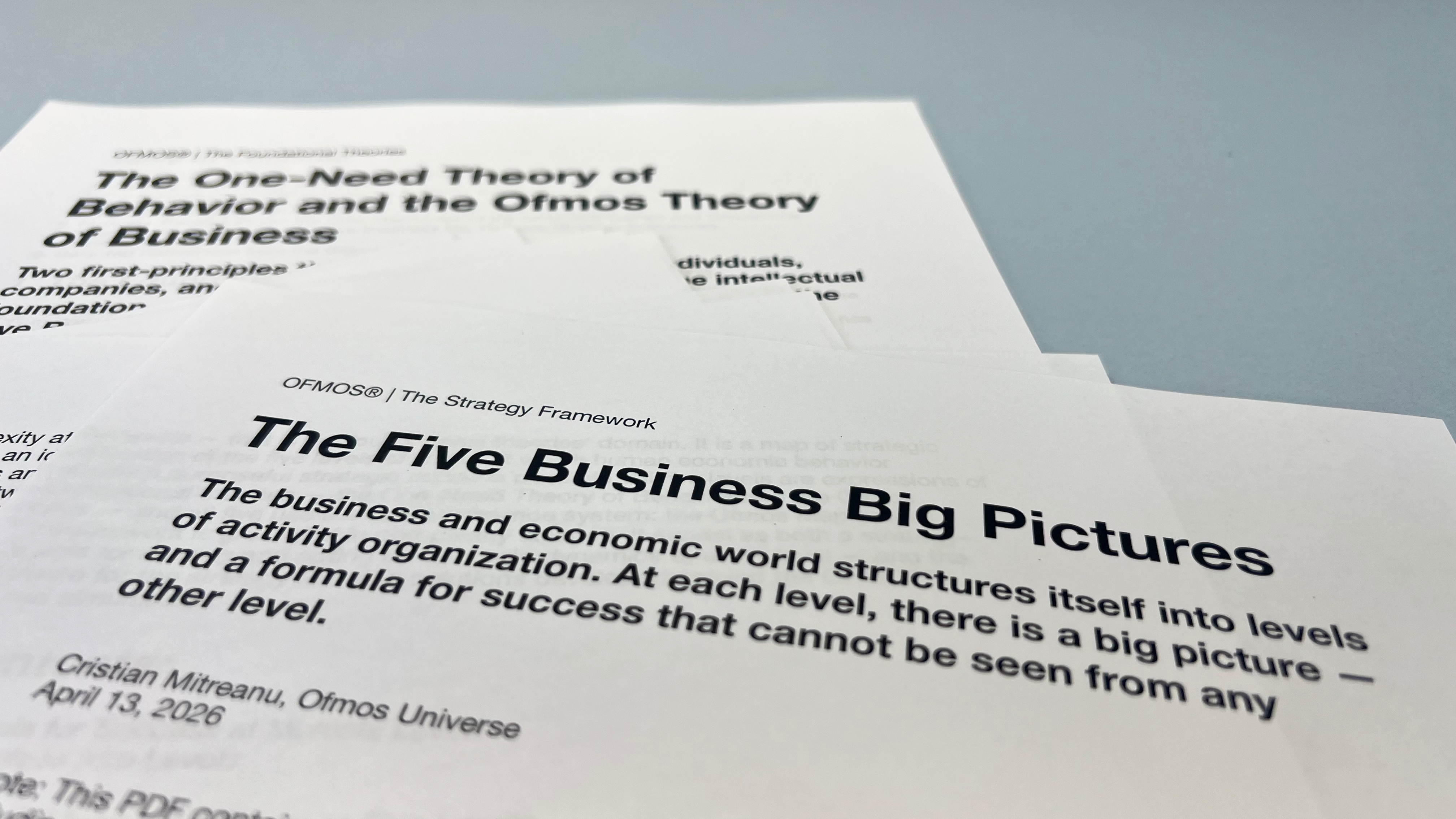 Its foundation: two first-principles theories Mitreanu developed over two decades of research. The One-Need Theory of Behavior explains how individuals pursue successful existence through a hierarchical structure of needs, identifying the mechanism that drives commoditization. The Ofmos Theory of Business extends that process to companies and economies, naming commoditization as an emergent structural force and innovation as its strategic counterforce. Together, they give strategic dynamics a unified account from the individual decision to the economy.